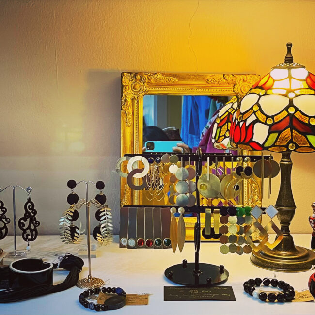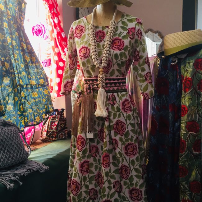 L’abito Rose in tutta la sua grazia a Passi in Piazzetta. Ho voluto evidenziare il punto vita con una fusciacca che nel suo studiato contrasto sembra nata per stare lì. La collana è un ciclopico tripudio di conchiglie, un tributo d’amore al mare. Il cappello in estate è un